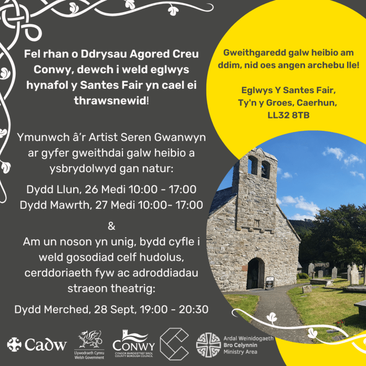 Join us at St. Mary’s Church (Caerhun) on Wednesday 28th September for a magical art installation. There will be theatrical, bilingual telling of stories from the ‘Mabinogi’, as well as other myths and legends that have local resonance. The performance begins at 7.30pm, with live music as you enter the ancient church from 7pm.