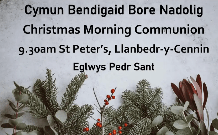 Christmas Morning Communion at St. Peter’s Church, Llanbedr-y-Cennin (25th December 9.30am) Posted byBro CelynninDecember 22, 2022Posted inUncategorized Share this: Click to share on X (Opens in new window) X Click to share on Facebook (Opens in new window) Facebook Like Loading...