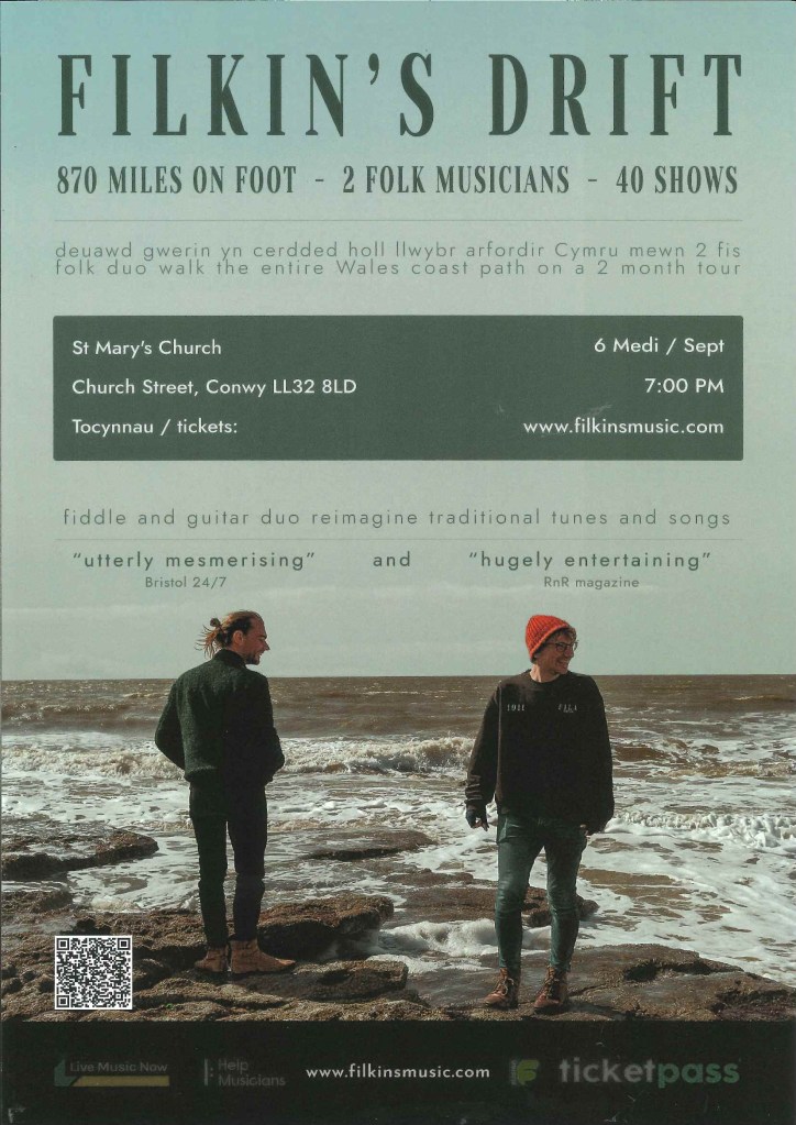 Filkin’s Drift are performing at St. Mary’s Church in Conwy on Wednesday 6th September (7pm). The folk duo is currently touring on foot, walking all 870 miles of the Wales Coast Path with their instruments: