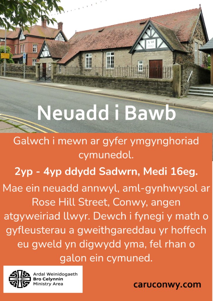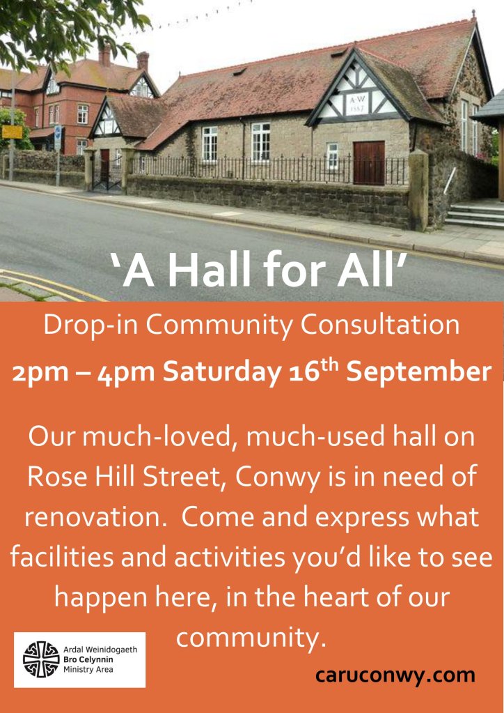 A public consultation regarding the church hall in Conwy is being held at the hall on Saturday 16th September (2-4pm). We are in the process of applying for funds to renovate the building, so please come along to tell us how you would like it to be developed for the benefit of your community.