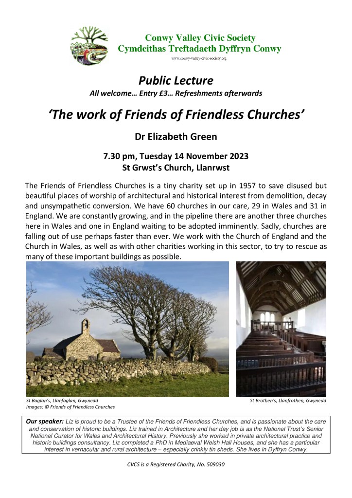 An important, interesting public lecture next week in St. Grwst’s church, Llanrwst, given by Dr Elizabeth Green. Many unused churches are in decline, and the work Friends do conserving these important cultural and historical buildings is really very important; and impressive. A worthwhile way to spend an evening sure to be of interest to many of our friends.