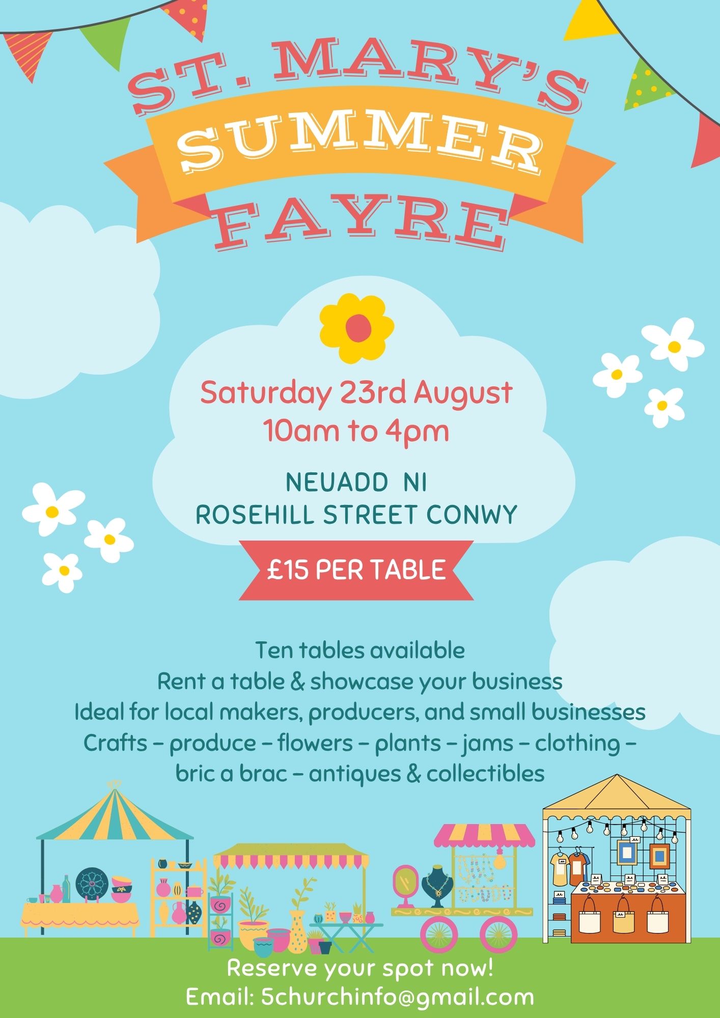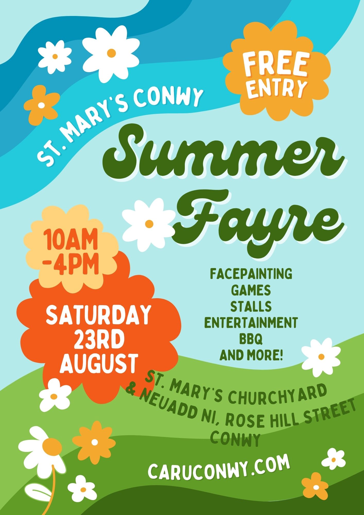 Save the date! The team at St. Mary’s Conwy are hosting a Summer Fayre, with plenty to enjoy on the August bank holiday weekend, Saturday 23rd from 10am-4pm. Have something to donate for the stalls or would like to volunteer? Get in touch with Nic, Kevin, Chris, Joan, Lynn or Diane for more info!