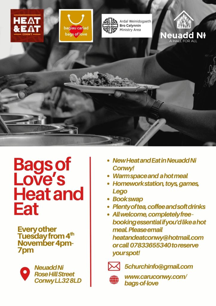 The Bags of Love Team are so pleased to launch two new warm space initiatives this winter. Starting 4th November, the new Heat and Eat in association with Dave Fare from Conwy’s Heat and Eat, will run 4pm-7pm every other Tuesday. There will be a homework station, arts and crafts, board games, and a swapping library, plenty of hot and cold drinks, and a hot meal for all who would like to join us. There are no requirements to join, just come along if you’d like to drop in, if you’d like a hot meal then please contact Dave Fare direct on 07833655340 or by email heatandeatconwy@hotmail.com