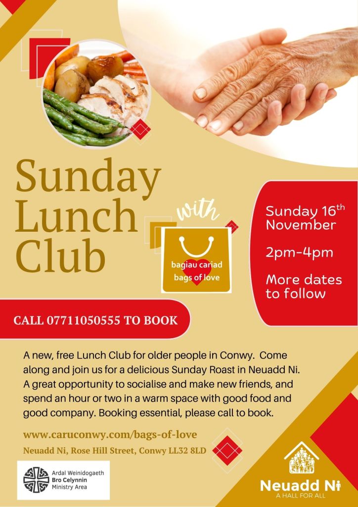 Bags of Love is also delighted to introduce the new Sunday Lunch Club. Designed for older people in Conwy and the surrounding areas, the Sunday Lunch Club will be a wonderful opportunity to get together for a slap up Sunday Roast with friends old and new, all completely free – there may even be some lovely music to reminisce to! The first date will be Sunday 16th November 2-4pm. Booking is essential, please call Nic on 07711050555 to book your space.