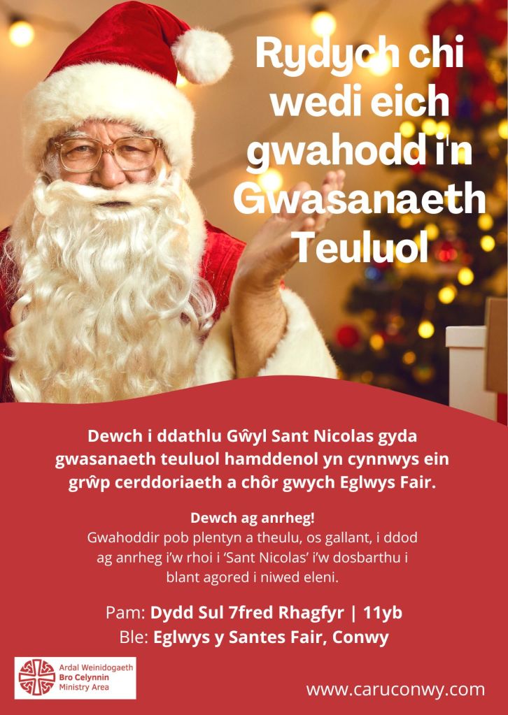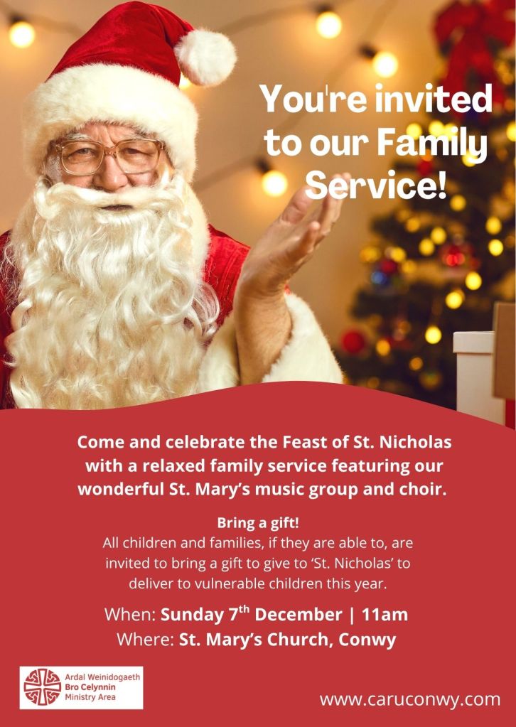 We look forward to welcoming you to our next Family Service on 7th December at 11am, when we mark the Feast of St. Nicholas with a very special visitor! The St. Mary’s music group and choir will once again accompany this relaxed family service with music and singing, and a very special visitor dressed in red and white will be joining us for a very special reason – everyone attending is invited to bring a gift to give to St. Nick if they are able, who will deliver them on Christmas Eve to vulnerable children in our community.