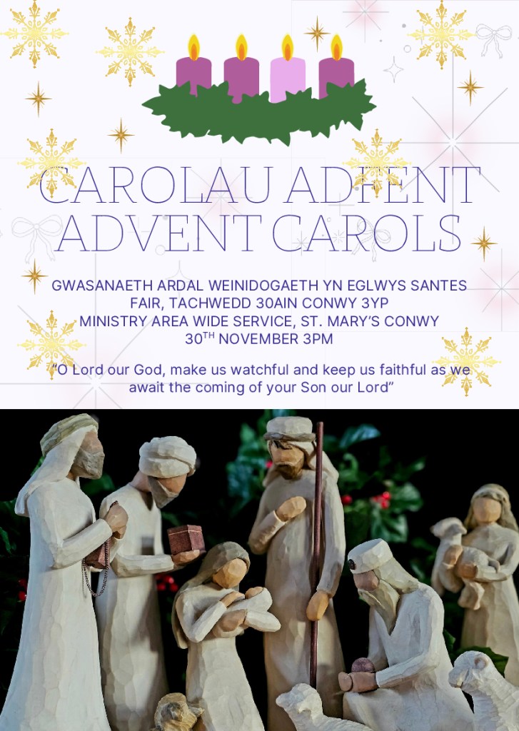 As it falls on the First Sunday of Advent, this week we will come together at the later time of 3pm in St. Mary’s Church Conwy for a special service of Advent Carols. There will be no other services in our churches that day.