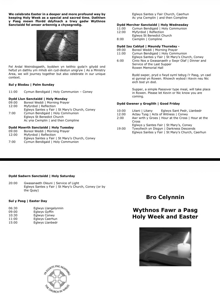 Holy Week and Easter Posted byBro CelynninFebruary 27, 2026February 27, 2026Posted inEventsTags:easter, holy week, pasg, wythnos fawr Share this: Share on X (Opens in new window) X Share on Facebook (Opens in new window) Facebook Like Loading...