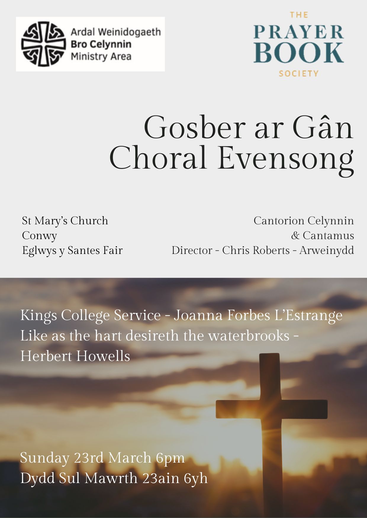 Cantorion Celynnin are once again pleased to join with Cantamus for another beautiful choral evensong service in St. Mary’s Conwy, with The Prayer Book Society. The 1664 Prayer Book has a wonderfully timeless quality that maintains a strong cultural significance in our life of worship. The choirs will sing Joanna Forbes L’estrange’s Kings College Service,Continue reading “Evensong with the Prayer Book Society on 23rd March in Conwy”