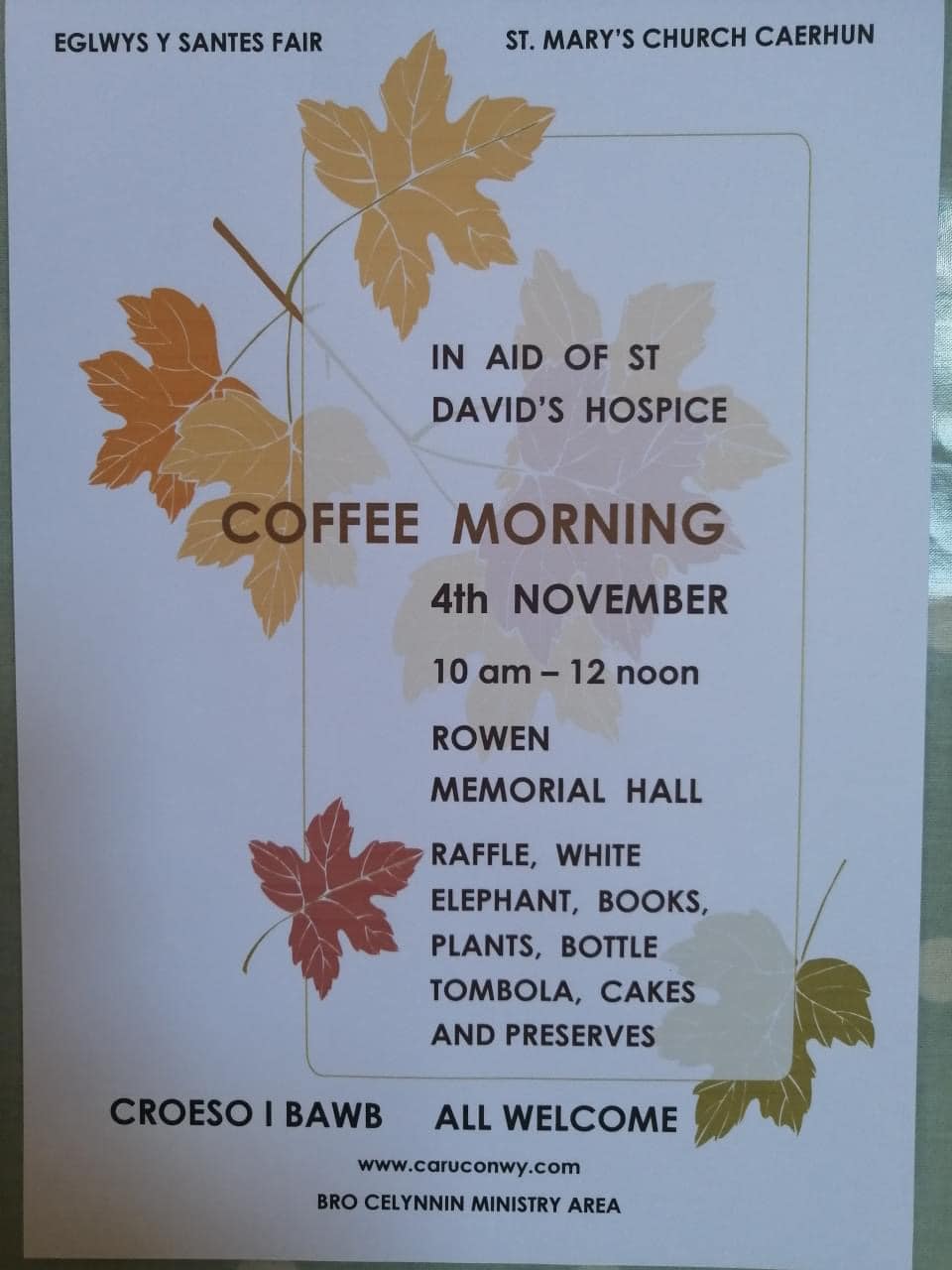 St Mary’s Church Caerhun invites you to a Coffee Morning on Saturday 4th November at Rowen Memorial Hall, 10am – 12 noon.This is in aid of St David’s Hospice. Entrance is free! We hope you will find something interesting or delicious on one of our stalls: Cakes & produceBooksWhite ElephantPlantsBottle TombolaRaffle We do hope youContinue reading “Coffee Morning, St Mary’s Caerhun”