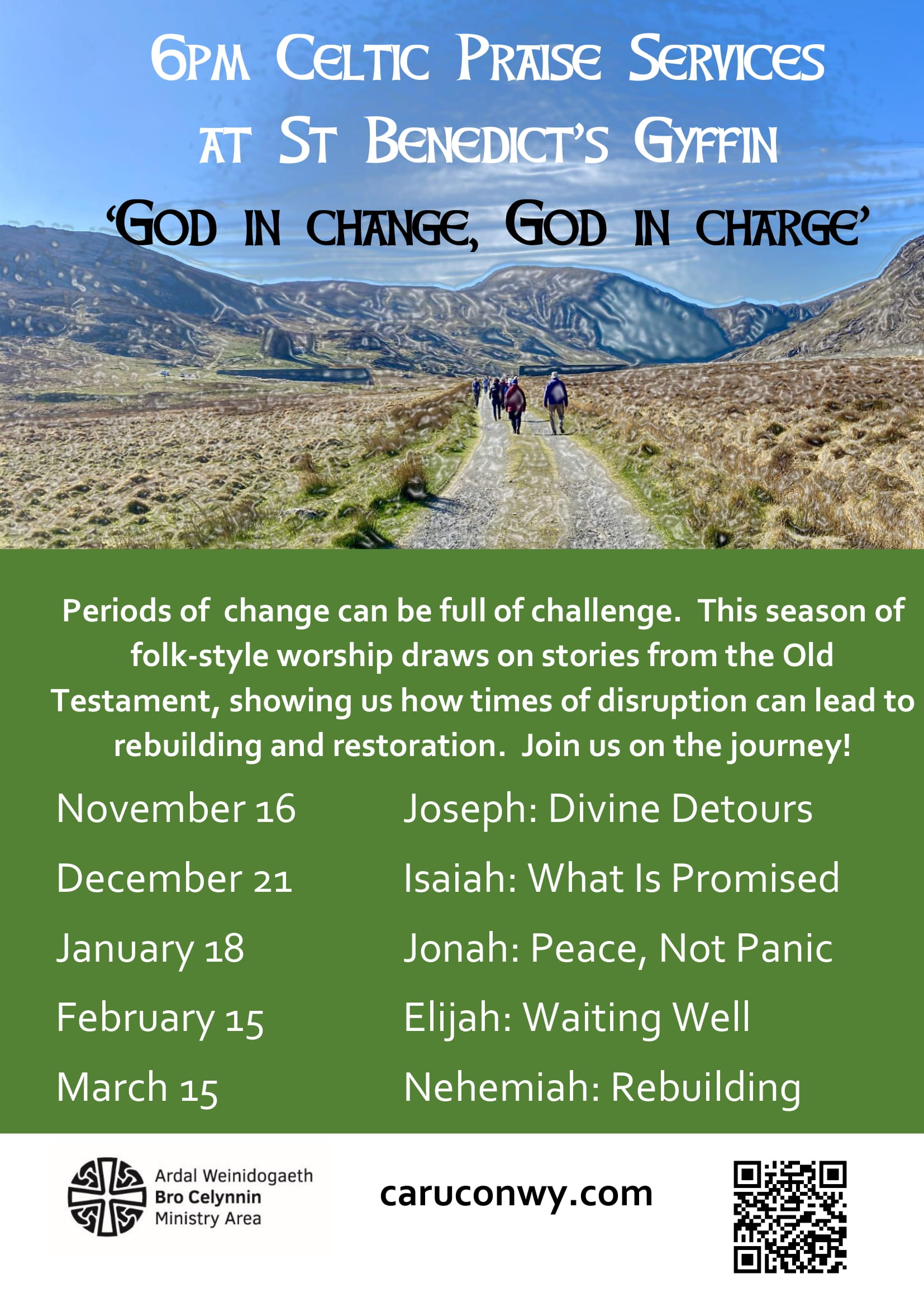 On the third Sunday of the month (November to March), St Benedict’s hosts the winter season of Celtic Praise – before it returns to Llangelynnin (from Easter to October). Expect beautiful acoustic folk-style worship in a candle-lit setting, with a warm welcome: always a reflective, soul-uplifting experience. The 2025/26 season will focus on where we see God in times of change, drawing on the ancient wisdom found in stories from the Old Testament.