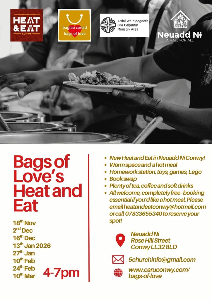 If you’d like to come along to our next Heat and Eat (dates below), please email Dave at heatandeatconwy@hotmail.com to confirm you’d like a hot meal – booking essential so we can plan for catering!