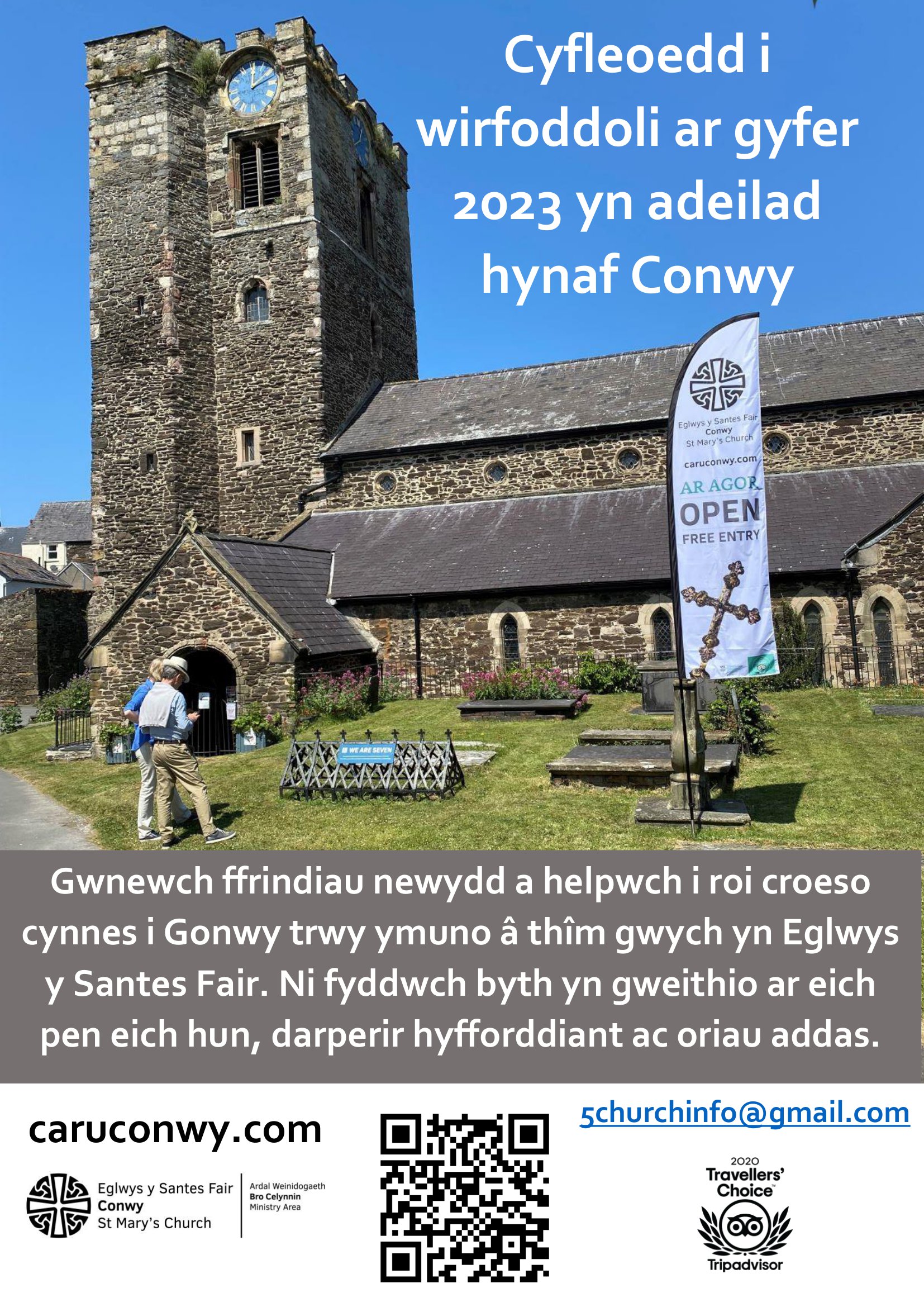 St Mary’s Conwy is the heart of the town: its oldest building, having been the site of the Cistercian Monastery (Aberconwy Abbey) since the late 12th century. It is packed full of history: stories our welcome team love to relate to our thousands of visitors. But it is still also a vibrant worshipping community, with year-round events and of course, a sanctuary of prayer, offering a space to encounter God.