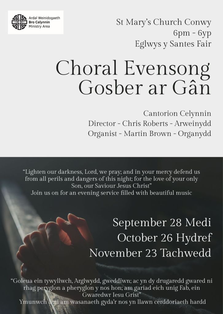and music and joining in the hymns. The poster shows the upcoming Choral Evensong services in St. Mary’s Conwy – we’d love to welcome you.